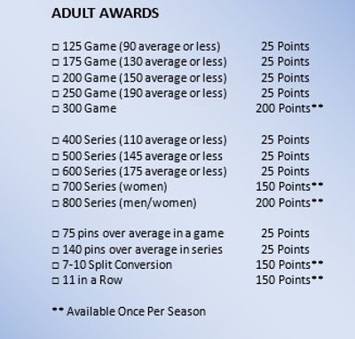 Starting in 2025, River Valley USBC league bowlers will be eligible to participate in the new points system. Once awards are earned the bowler will receive an email to create an online account. Bowlers can then view their current point totals and award redemption options by logging into their account.